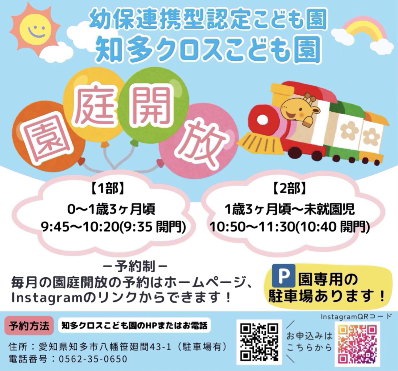 ◯知多クロスこども園では未就園児のために、当園で遊んでいただける園庭開放の日を設けます。